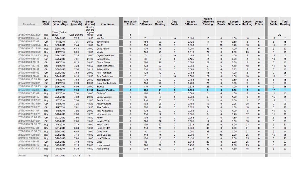 Cheryl and I are so excited to finally have Kyle in our lives. After an incredible labor and delivery, we have an incredible little boy. I’m sure a lot of you are wondering about that little BC contest we held for guessing the due date, weight, length, and gender. Well, I tallied up the results and found our winner: Jennifer Perkins from CEI! For all of you who don’t trust me, here are the results. I’m glad there was only one first place finisher, as there were six people who tied for second place!